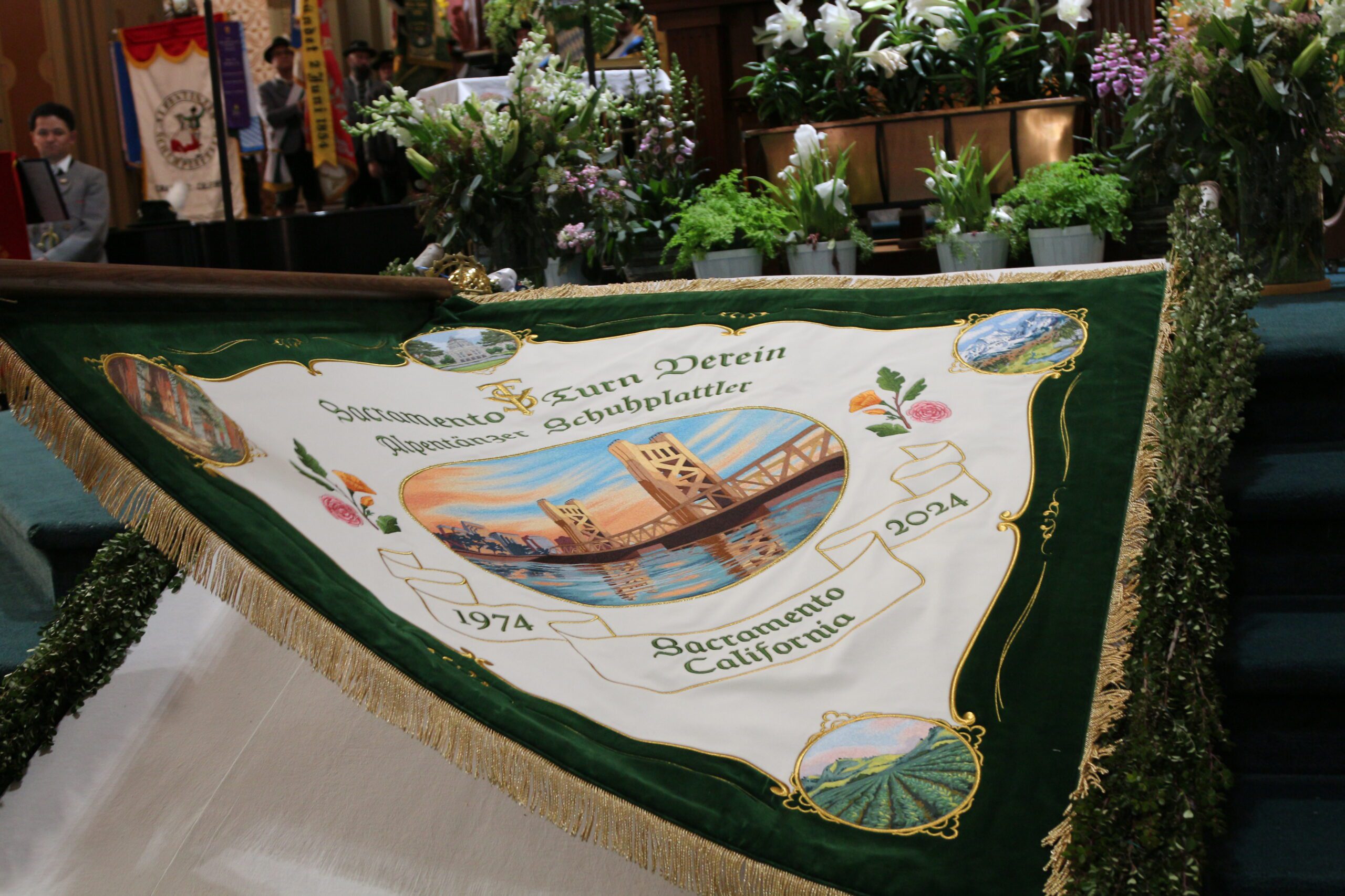 Upholding a centuries-old Alpine region tradition of representing regiments, congregations, schools, and social clubs with ceremonial flags, the STV Alpentänzer Schuhplattler commissioned a custom designed and embroidered Fahne in 2023. The Fahne was consecrated in a celebratory mass, or Fahnenweihe, in 2024, attended by members of fellow Vereine from across the US and Canada, followed by a parade of costumed marchers and flags through Midtown Sacramento and concluded with a festive Gala Dinner at the Sacramento Turn Verein.